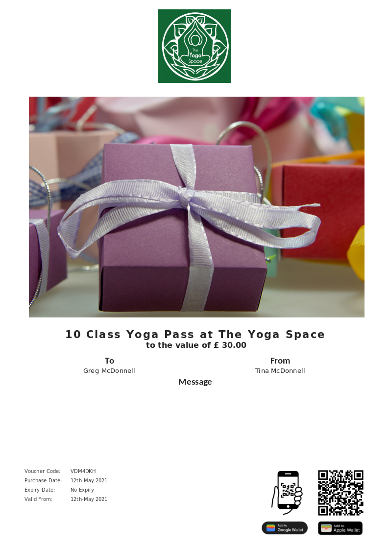 The Yoga Space allows you to purchase instantly printable gift vouchers, special offers and tickets using the Voucher Connect platform.